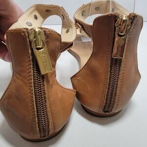 Isola sandal size 7.5 with ankle strap. Gold spikes/studs as embellishment. Brown with zip closure. Nonsmoking home with awesome pugs and a crazy bulldog.