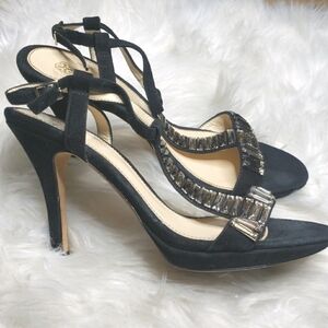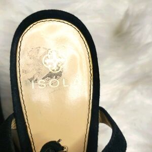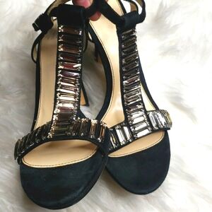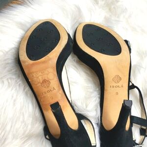 ISOLA Black suede platform heel. T- Strap has crystal embellishments. Adjustable Ankle strap. Heel 4.5” platform 1”