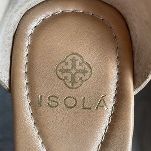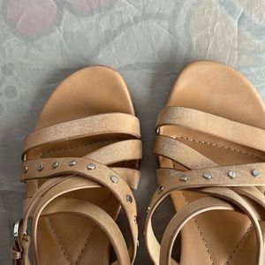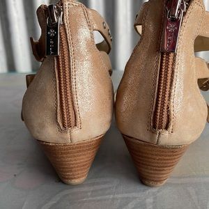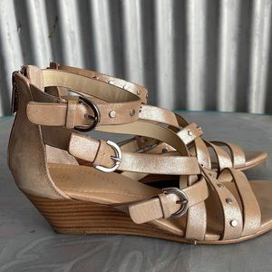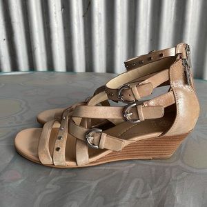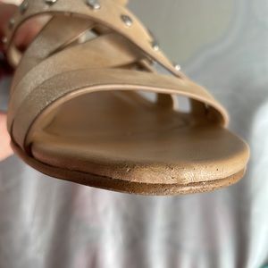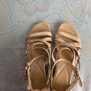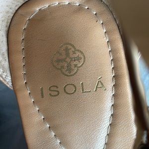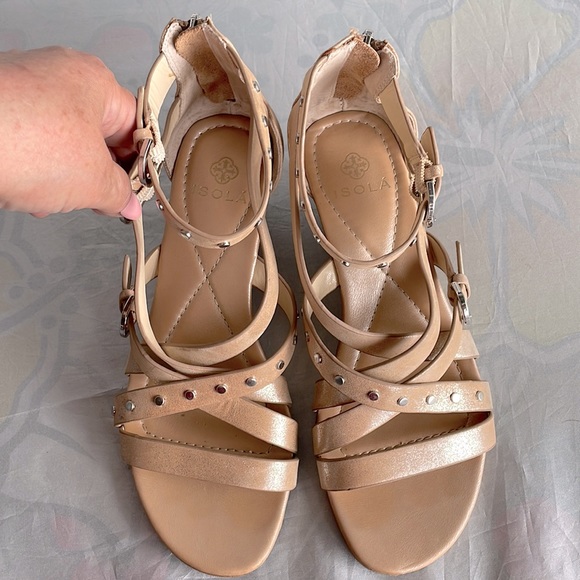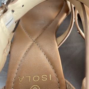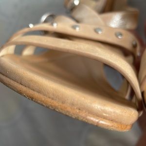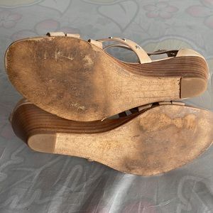 Nude with silver hardware. Measurement: width 3.5 inches, length 9.5 inches heel height 2 inches excellent condition worn only a few times and very comfortable! Space only selling because Work does not allow me to wear open toed shoes anymore. Love these shoes!