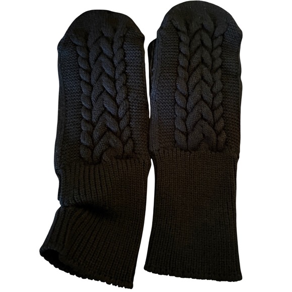 Isotoner Black Cable Knit Mittens Leather Palm Thumb