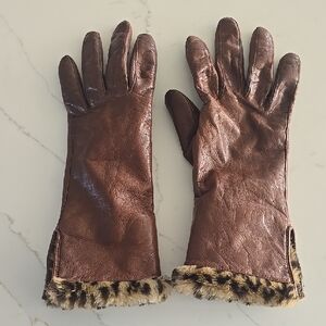 Elegant brown leather gloves. Features a stylish faux fur cuff with leopard print. Perfect for warmth and style.