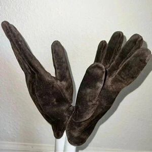 Isotoner Dark brown suede leather gloves with 3 points in wonderful condition! Thin black fleece lining.