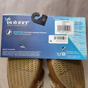These slippers by Isotoner feature a round toe design with a slip-on closure.