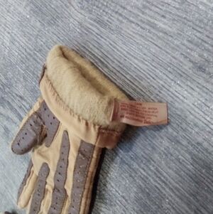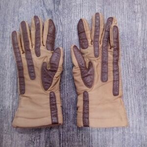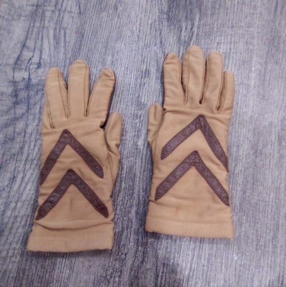 Stylish gloves featuring a classic tan and brown design. Perfect for adding a touch of elegance to any outfit.