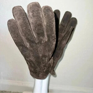Isotoner Dark brown suede leather gloves with 3 points in wonderful condition! Thin black fleece lining.