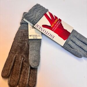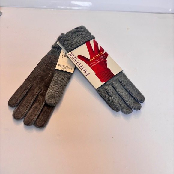 Keywords: Isotoner, knit gloves, womens gloves, winter gloves, warm gloves, suede trim, fashion accessories, cold weather, outdoor gear, cozy gloves, stylish gloves, gray gloves
