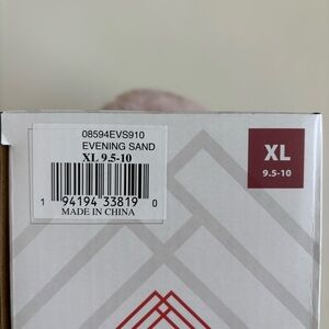 These are new and unworn, still attached with an elastic band. The color is Evening Sand but to me it is just pink. They also have metallic flecks on the knit part. These are hoodback style meaning they have a slightly raised back to cradle your feet. I opened the box to take a photo of the heel with the faux fur lining.
