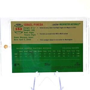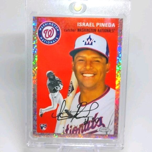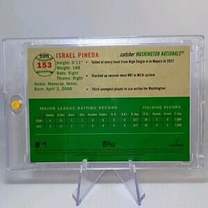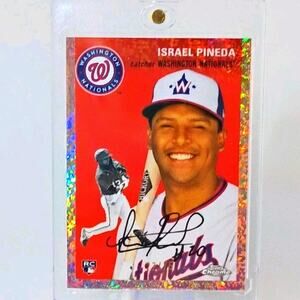 The product is a rare and collectible Israel Pineda #153 Topps Chrome Rose Gold Speckled Refractor trading card from the 2023 SP set, limited to a print run of only 75 cards. Manufactured by Topps, this sports trading card features a chrome finish and belongs to the Major League Baseball category. The card showcases Pineda as a player for the Washington Nationals and is a highly sought-after item for fans and collectors alike.