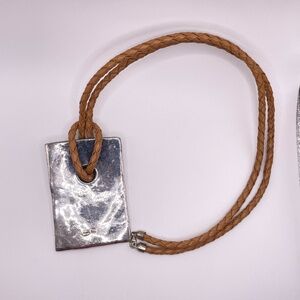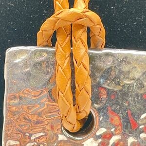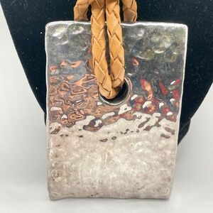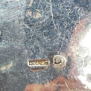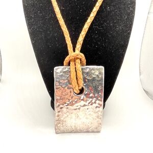 Israel signed Modernist style large hammered look silver plated pendant with camel color leather like cord and sterling clasp. The pendant is stamped Israel on the back with another mark I wasn't able to identify. NOTE: Given the wear of the silver at the top of the pendant, front and back, I do think this is just silver plated -- SEE PHOTOS. The lobster claw clasp is stamped 925. The cord has a drop of about 15". The pendant is rather lightweight. Pre-owned. Please ask if you have questions.