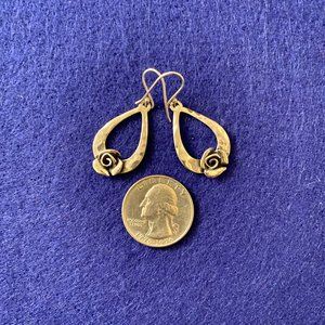 Pretty pair of open teardrop earrings of hammered sterling silver, each bearing single stylized rose at the bottom. Small round loop bails accommodate ball-tip fishhooks. Polished with an oxidized finish on flower. I have several pieces with the hallmark B in a circle and these have the typical Modernist flair. The hallmark B, country ISRAEL and 925 are all engraved on the back.