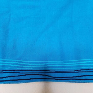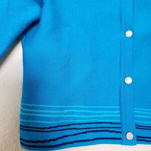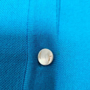 Beautiful blue with pearl buttons with brand imprinted on each button. 3/4 sleeves, cropped, can be worn as a button up to our cardigan. No flaws.