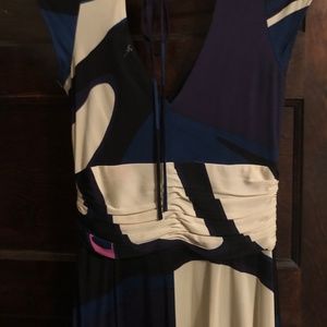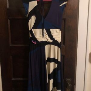 Issa from London party dress, size 4 in a mod print with black, navy, bright blue, cream, and pink. V-neck, ruching at the waist, tie back with a swing skirt. Cocktail party, rehearsal dinner, dancing...go for it!
