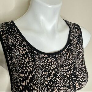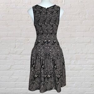Issa London, dress, fit and flare, geometric print, black tan, knit dress, sleeveless, rounded neck, zip back, stretchy, rayon, spandex, medium, versatile, elegant, classic, comfortable, stylish, occasion wear, day to night, career, cocktail, party, designer, fashion, chic, flattering, quality.