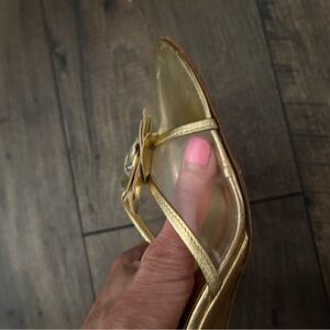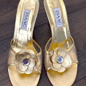 Issac Mizrahi Gold Leather & Clear Heel Sandal w/ Rhinestone Flower SZ: 7.5