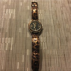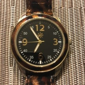Very cute Issac Mizrahi Live Watch. Band is leather. Works perfectly but needs a battery.
