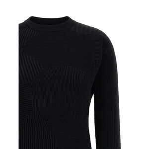 Kone Kone' midi dress in patchwork, seamless pleated fabric, elastic weave structure made with multiple knitted patterns, round neckline, long sleeves, side split, and asymmetrical hem.<br>true to size fit<br>100% polyester
