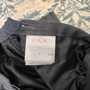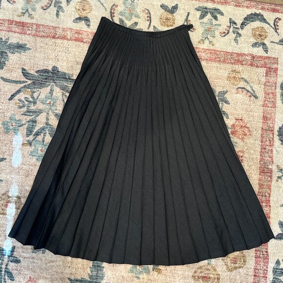 ISSEY MIYAKE 100% wool pleated dark grey midi skirt, with side zip closure and button. This skirt is in excellent and like new condition, with no pilling, tears, stains, or odor. Such a beautiful option to wear dressed up or down for the colder seasons! The skirt is lined so there is a polyester lining underneath the wool skirt so it isn't itchy :) Measurements: 13.5 in waist, 29.5 in length.