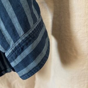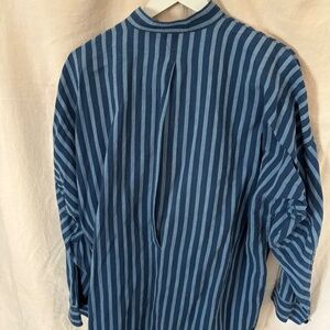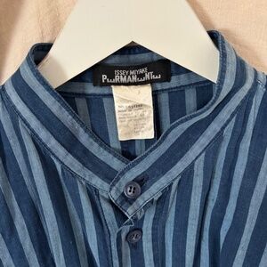 This Issey Miyake blue on blue striped overshirt is a size medium. Details include a banded collar, button front closure, cuffs, and a hidden single pleat in the back to provide ease of movement.