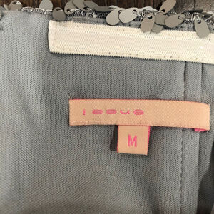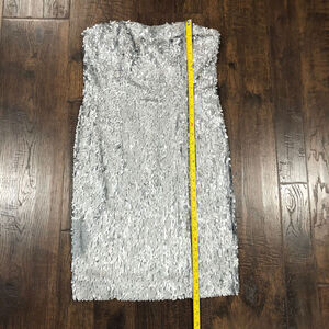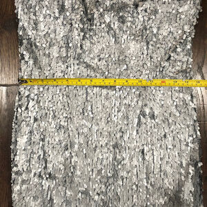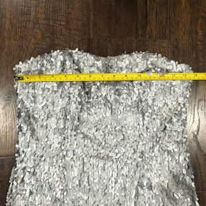 Issue New York Women’s Medium Dress Silver Sequined Sleeveless Mini Party. No noticeable stains. There is a small snag on the lining of the dress, which I’ve tried to capture in photos. It’s not noticeable with the sequin outer layer. There is a rigid lining on the bodice area. Measurements are also shown in photos.