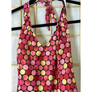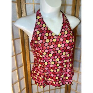 Bright and beachy tankini top from It Figures. Size 16. Halter style top. Fully lined. Padded shelf bra. 97% polyester, 3% spandex. Hand wash. Made in Canada. Excellent condition. Nonsmoking home.