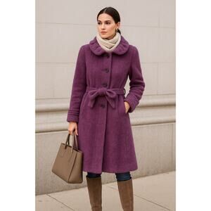 Elevate your winter wardrobe with this stunning Itala Testino ruffle coat, crafted from a rich alpaca wool blend in a regal purple hue. Featuring a romantic swing trench silhouette, ruched sleeve accents, a dramatic ruffled collar, and a belted waist for a flattering fit. Perfect for chilly days, holiday events, or layering over eveningwear. A timeless, sophisticated statement piece.
