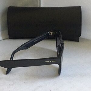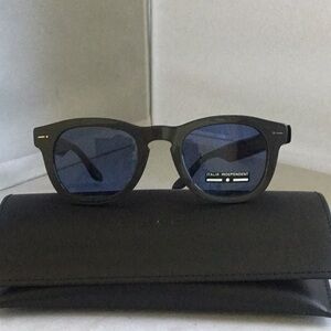 Chic black sunglasses featuring bold blue lenses. Perfect for a modern look.