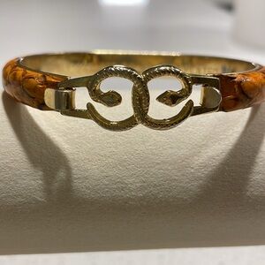 Beautiful, rarely worn 24KT gold plated Italian snakeskin bracelet. The clasp features two (2) intertwining snakes. Bracelet measures approximately 8”.