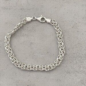 Lightweight but with lots of presence, perfect for layering. Made in Italy of fine .925 sterling silver in an intricate Byzantine link pattern. Lobster claw clasp. Hallmarked and acid tested for authenticity. Bright and shiny, this appears to be new.