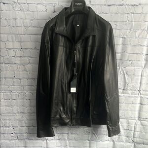 CURGÈ Men's Black Leather Zip Up Jacket Made in Italy size 2XL or EU size 64 new with tags, never worn. Document not included in sale, photographed to prove a valid Italian company.