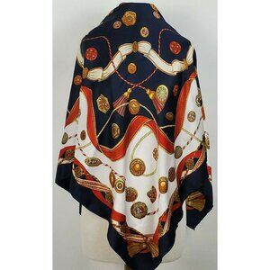 Italian Blue Framed Scarf Wrap Medallions Tassels 44" Square Vintage Polyester
