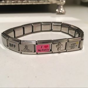 Set of 2 stretchy Italian charm bracelets. Come with 8 charms. Plenty of spots left to add more charms. Also comes with 7 plain "squares" if you need to make either of the bracelets larger. Charms included are: heart, butterfly, flower, BFF, Friendship, I Love My Family, cross, and Wish Upon a Star. Could wear as two separate bracelets, or combine all the charms onto one bracelet. Asking $20 for the PAIR.