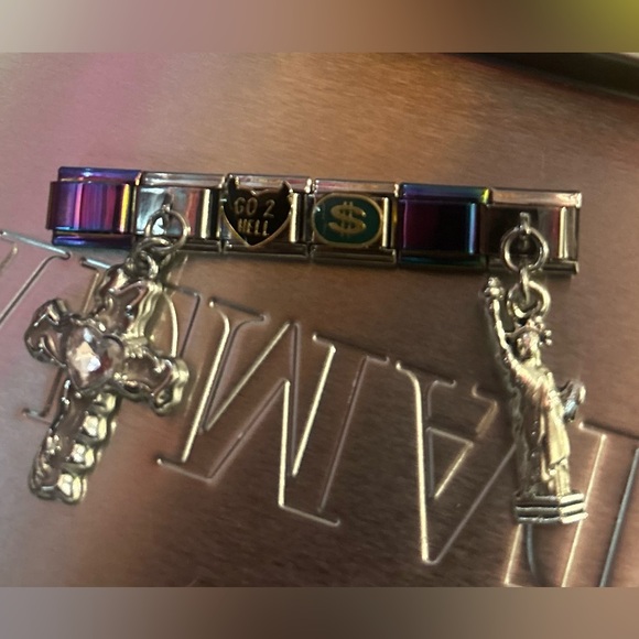 Vibrant bracelet featuring silver charms including a cross and the Statue of Liberty.