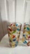 Set of glass tumblers with vibrant leaf patterns. Features red, blue, green, and yellow leaves.