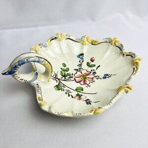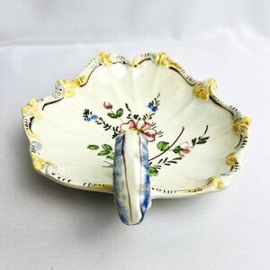 This beautiful vintage ceramic dish, marked "Italy," features a charming hand-painted floral design with pink, green, and blue flowers and leaves. The dish has a scalloped edge with yellow and blue accents, adding to its decorative appeal. The handle is also adorned with blue and yellow detailing, making this piece a lovely addition to any collection. Perfect for display or use, this unique dish showcases the craftsmanship and artistry of Italian ceramics.