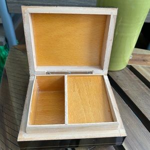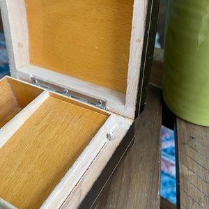 In good condition. It’s a great sturdy wooden box and only has minor cosmetic scratches but nothing too visible. Gives the box great character. The tool to start the music has caused some rubbing on the wood but that’s natural.