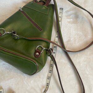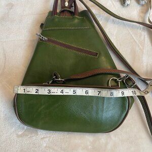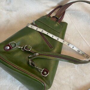 Italian Leather Backpack purse Made in Italy, purchased in Italy, Lucia Pelletterie brand. Never used. Green and brown, very soft leather. Nice shine to it. The single crossbody strap unzips into two straps to function as a backpack. Two exterior pockets, one interior pocket. Has it's original tag, but tag is not attached. Excellent condition!