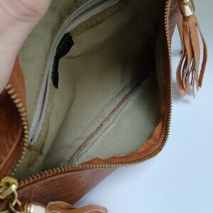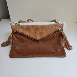 Italian Leather Caramel Brown Stamped Reptile Crossbody/Clutch Bag Zip Front with Fringe Zipper Pulls