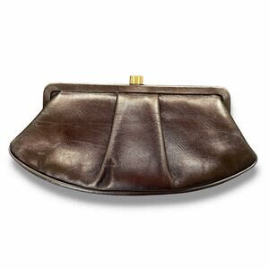 Vintage Lambertson Truex clutch in dark chocolate metallic leather with pleated front and gold-tone push-lock clasp. Lined in powder blue suede with interior zip pocket. Made in Italy.