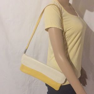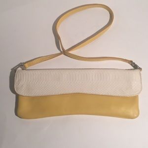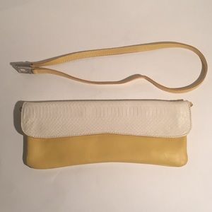 Pretty shoulder Bag and Clutch. Leather. Embossed details. Measurements: 12”x5”. Almost New