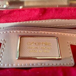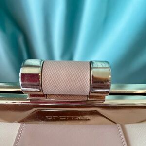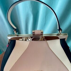 Italian designer Cromia frame leather handbag with dark pink, light pink and black pieced pattern.. Single handle, snap closure, detachable shoulder strap. Beautiful red satin lining, interior pockets. Gold accents, gold footed base. 8” x 12 1/2” x 6 1/2”. A real showpiece.