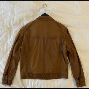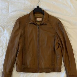 Handmade Italian Leather Bomber Jacket in Camel Brown purchased at La Pelle in Florence, Italy. Men's Italian Size 58, US Men's Size 48. Please see photos for measurements before purchasing. Like new, pre-owned with few scratches or stains. Worn less than 10 times. Due to screen color variations, actual color may vary. Actual jacket is photographed. Original retail price is 395 euros plus 45 euros shipping ($532 USD as of 5/13/21). No returns or exchanges.