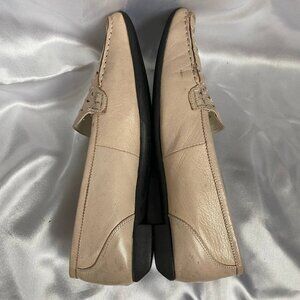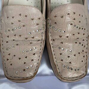 Italian Leather Ultra Comfortable Women’s Loafers. Size: 6.5. Color: tan. Features beautiful rhinestones and laser cut hearts design in the front. Excellent craftsmanship, super soft leather. Non-slip bottom soles. Just a couple of minor scuffs that can easily be polished off. Great condition! This color goes with absolutely everything!