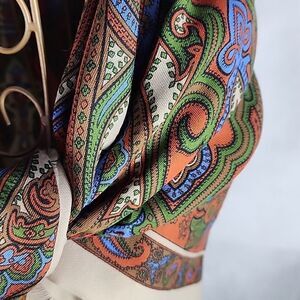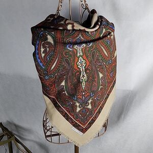 42" square Italian scarf by maker Marco Corsari. Colors of tan, olive, lavender and rust. Eyelash fringed