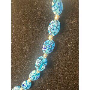 This exquisite Italian Millefiori glass necklace adds a touch of elegance to any ensemble. The intricate floral patterns in vibrant blue hues create a captivating piece. Crafted with meticulous attention to detail, this necklace is an ideal accessory, offering both beauty and sophistication. Enhance your collection with this stunning piece that resonates with timeless charm.
