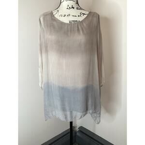 Tunic top made in Italy by Prontomoda Giusy. Two layered top has attached tank with sheer overlay and both have ombre coloring. Tank underneath is made of soft stretchy Viscose and has a tie dye look to the ombré. Sheer over layer is 100% silk (stiffer not silky silk) does have a textured feel to sections of it so I don’t know if that is a flaw or original. Slight discoloration of the pit area on the tank. The top layer has sequins running down the 3/4 sleeves and has a boxy fit with side slits. High low hem to the sheer overlay with approximate measurements of 25 inches in front and 30 inches in back. Pale pastel shades of gray and just barely blush pink which is almost a nude or light taupe color-hard to describe. Has two light spots near the hem in front. Size Medium. Offers are encouraged! Bundles of 2 or more items get a discount!