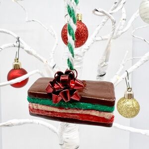 Add a sweet touch to your holiday décor with this handmade Italian Rainbow Cookie ornament! 🍪🎄 Inspired by the classic seven-layer Italian rainbow cookie, this ornament is crafted from polymer clay with a glossy chocolate “ganache” top and festive red, white, and green cookie layers. Finished with a tiny Christmas bow and baker’s twine hanger, it looks like a delicious holiday treat for your tree.