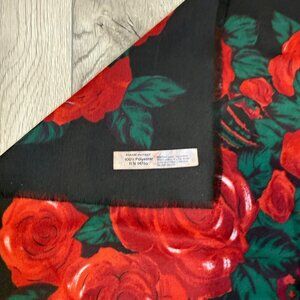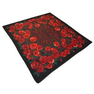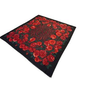 Vintage Italian Square Scarf Featuring A Stunning Black Background With Bold Red Roses & Green Leaves In Intricate Paisley Design Fringe Hem