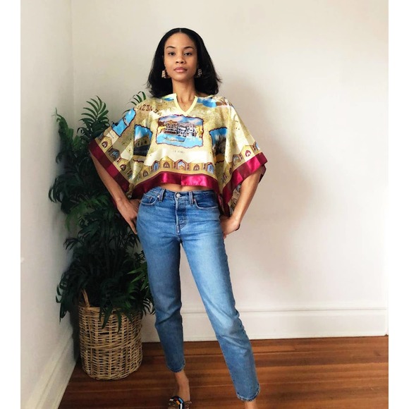 Upcycled from a vintage scarf. Top is semi sheer.