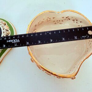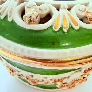 This charming porcelain trinket box tells a tale of elegance and craftsmanship. Its heart shape adorned with intricate gold detailing and rich green and cream colors offers both beauty and functionality, perfect for holding cherished keepsakes. Handmade in Italy, it carries a timeless design that whispers stories of artistry and heritage.