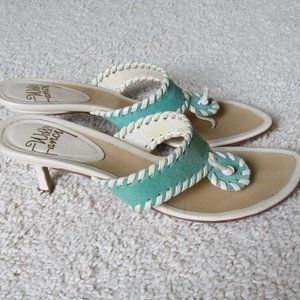 3. Green kitten suede sandals are in good condition with signs of wear on the outsole and a black mark on the right heel (please see photo), 2 1/2" in high, size: 6